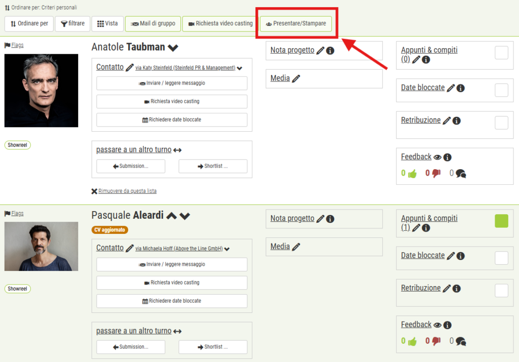 A tale scopo, utilizzare le “Flags” sopra la foto dell’attore nell’elenco. È possibile definire Flags individuali per ogni progetto, con un titolo e una selezione di colori. È anche possibile contrassegnare una persona con più Flags e filtrare in base alle Flags, ad esempio per visualizzare solo le persone con lo stato “Disponibile” o “retribuzione chiarita”.